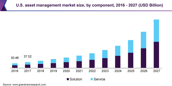 The global asset management market size is expected to reach USD 1,292.17 billion by 2027, according to a new study conducted by Grand View Research, Inc. The market is anticipated to register a CAGR of 25.9% from 2020 to 2027. The factors driving the growth include the increasing need to reduce the downtime of equipment and ensure optimum utilization of the available resources. Advances in the latest technologies, such as Artificial Intelligence (AI), Internet of Things (IoT), and infrastructure automation, coupled with the continued integration of analytical and business intelligence tools in asset management solutions are also expected to drive the market growth. The growing awareness about the advantages of IoT-based asset management solutions particularly bodes well for the growth of the market.