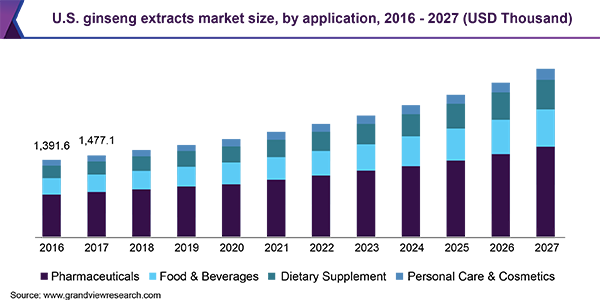 These products help in strengthening the immune system, tackling fatigue, brain function enhancement, and lowering blood sugar, which is likely to propel the demand for ginseng extracts in medicinal applications. Rising awareness and adoption of biologically-derived ingredients in the pharmaceutical industry is one of the key factors for market expansion.