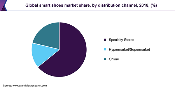 Based on distribution channel, specialty stores held the largest market share of 64.1% in 2018, owing to easy availability and wide distribution network of these stores. Rising number of footwear stores in developing countries owing to increasing preference for new and smart wearables has added to the demand for these stores in countries such as Brazil, India, and China. Mass brands such as Nike Inc.; Under Armour, Inc.; Adidas AG; and Xiaomi among others have multiple outlets featuring shoes and other sports accessories across different parts of the world.