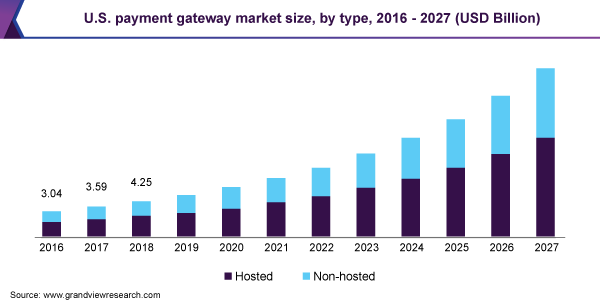 The global payment gateway market size is expected to reach USD 71.22 billion by 2027 registering a CAGR of 21.5% from 2020 to 2027, according to a new report by Grand View Research, Inc. The market growth can be attributed to the increasing use of these billing methods across the globe. Growing usage of various digital channels for payments has also been driving the market growth.