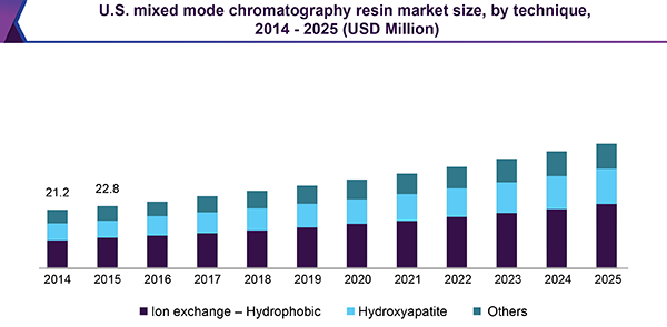 The Ion exchange — Hydrophobic resin segment is expected to dominate the global market till 2025. Demand for this technique is attributed to growth in drug discovery by pharmaceutical companies. These companies use chromatography techniques to separate complex mixtures and purification of materials. Increasing number of epidemic diseases such as Zika and Ebola is expected to further boost the mixed mode chromatography resin market.