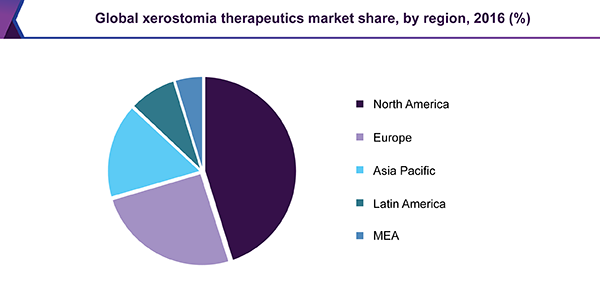 - North America held the largest share in 2016 owing to factors such as increasing prevalence of diseases resulting in dry mouth and growing initiatives for raising awareness about xerostomia