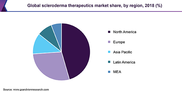 - U.S. held the majority of the share in 2018. Expected label expansions and expected launch of first-in-class therapies coupled with an evolving reimbursement landscape for orphan drugs support continual scleroderma therapeutics market growth