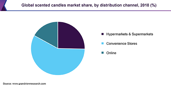 - The online segment is expected to witness the fastest growth at a CAGR of 9.2% from 2019 to 2025. Most major manufacturers are spending on the development of their in-house online distribution channels, in order to serve their buyers. Convenience stores accounted for more than 55% of the global scented candles market revenue in 2018