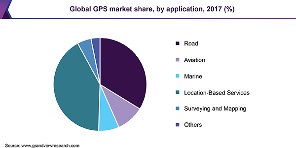 - The location-based services application segment accounted for over 41.0% of the global GPS market in 2017 owing to a surge in the demand for GPS devices for navigation and travel, retail and real estate searches, geo-social networking, and mobile marketing and advertising purposes