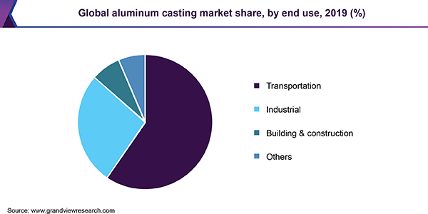 In Asia Pacific, the aluminum casting market is dominated by China due to numerous economic benefits offered in the country when it comes to green energy. The country is the largest producer of primary aluminum in the world as well as one of the biggest consumers of aluminum globally. China has taken advantage of the availability of high-tech manufacturing facilities as well as a highly-skilled workforce, which is essential for the manufacturing sector. The growing manufacturing sector in the country is anticipated to augment market growth over the coming years. India is also a major market in the region. The Automotive Mission Plan (AMP) 2006–2016 introduced by the government of India was launched to support the growth of the automotive industry in the country, which in turn is likely to drive the demand for aluminum casting over the coming years.