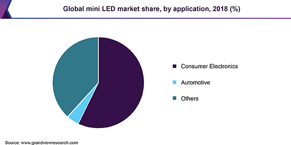 Increasing demand for miniaturized display in consumer electronics devices is expected to positively impact industry growth over the next few years. Mini light-emitting diodes are expected to aid chip makers in gaining market share and technology penetration. Chip sizes ranging from 100 to 200 µm were commercialized in late 2018. Consumer electronics, digital signage, and industrial displays have been the early adopters of this technology. High dynamic range and power-saving capability are some of the features that make them a suitable backlight solution for next-generation displays. Key players are expected to cash in on this opportunity by providing mini LED packages.