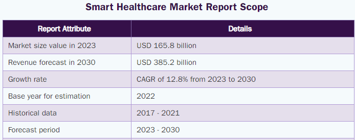 The global smart healthcare market size is expected to reach USD 385.2 billion by 2030, according to a new report by Grand View Research, Inc. The market is expected to expand at a CAGR of 12.8% from 2023 to 2030. The COVID-19 pandemic is likely to boost the market growth as these solutions help healthcare professionals to connect effectively with their patients and offer quality treatment. Owing to social distancing, remote patient monitoring, and virtual healthcare delivery is gaining momentum. For instance, the U.K. has introduced free virtual consultation during the coronavirus crisis. In April 2020, doctorinthehouse.net, a not-for-profit online healthcare service in the U.K. launched a platform in collaboration with volunteers amongst doctors, pharmacists, and specialist nurses aiming to schedule 25,000 online appointments and supply 100,000 online assessments for over 200 at-home clinicians. Such initiatives are expected to drive the market ahead.