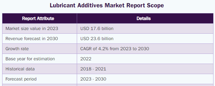 The global lubricant additives market size is expected to reach USD 23.6 billion by 2030, registering a CAGR of 4.2% from 2023 to 2030, according to a new report by Grand View Research, Inc. Stringent regulations regarding the permissible amount of carbon emission in the atmosphere are expected to remain a key driving factor for global lubricant additives market. Additive prices witnessed a significant decline in 2015 as a result of fluctuations in prices of key raw materials. Their prices are heavily dependent on prices of calcium carbonate, zinc metal, and crude oil.