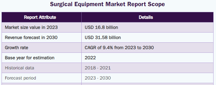 The global surgical equipment market size is expected to reach USD 31.58 billion by 2030, according to a new report by Grand View Research, Inc. It is expected to expand at a CAGR of 9.4% from 2023 to 2030. The growing geriatric population, a rise in the volume of surgical procedures, technological advancements, and an increase in awareness regarding the benefits of early surgical intervention are expected to drive the market.In addition, growing disposable income in developing countries and rising demand for minimally invasive surgeries are expected to propel the growth of the market over the forecast period.