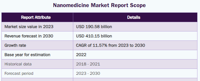 The developing technologies for drug delivery are important elements that are expected to accelerate the growth of the global market. Also, it is anticipated that the rising popularity of nanomedicine across a variety of applications will fuel the expansion of the nanomedicine industry. Furthermore, it is predicted that the increase in government funding and support will positively affect market growth in the coming years.