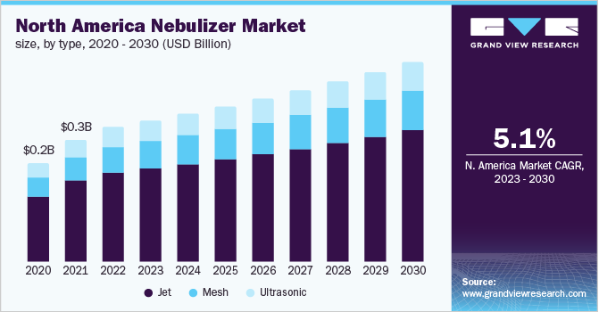 The global nebulizer market size is expected to reach USD 1.70 billion by 2030, expanding at a CAGR of 5.9%, from 2023 to 2030, according to a new report by Grand View Research Inc., Rising incidence rate of chronic respiratory diseases, increasing demand for home healthcare devices, and rising geriatric population worldwide are the major factors leading to the market growth.