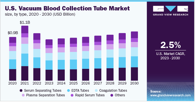 The global vacuum blood collection tube market size is projected to reach USD 3.20 billion by 2030, registering a CAGR of 3.02% during the forecast period, according to a new report by Grand View Research, Inc. Increasing prevalence of chronic and infectious diseases, a growing number of blood transfusions, coupled with rising hematological disorders are boosting the adoption of blood collection tubes. In addition, frequent disease outbreaks in endemic areas are anticipated to increase the demand for blood collection tubes for clinical diagnostics. The market is anticipated to witness rapid growth owing to the factors, such as the growing need for the identification of infectious agents, cancer biomarkers, cardiovascular diseases, women’s health issues, and substance abuse.