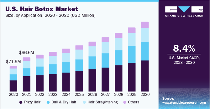 The global hair botox market size is expected to reach USD 577.2 million by 2030, according to a new report by Grand View Research, Inc. The market is expected to register a CAGR of 8.0% from 2023 to 2030. The market growth can be attributed to the rising adoption of these products due to increasing awareness regarding the benefits of this treatment over keratin treatment, as informed by social media influencers and celebrities. Hair Botox is the deep conditioning of hair that aids in reversing damaged tresses and offers smoothness and fullness to hair.