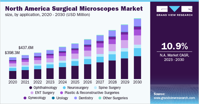 The global surgical microscopes market size is expected to reach USD 2.9 billion by 2030, growing at a CAGR of 11.35% from 2023 to 2030, based on a new report by Grand View Research, Inc. With the advent of surgical microscopes, it became easier for surgeons to perform such procedures more accurately in less time. In addition, the introduction of technologically advanced products is driving the demand for surgical microscopes as they are more precise, offer better illumination sources, and provide options for customization and technology integration based on the complexity of the procedures.