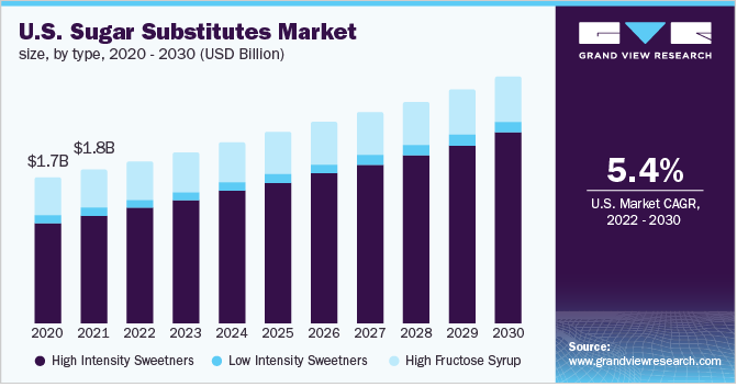 The global sugar substitutes market size is expected to reach USD 10.42 billion by 2030, registering a CAGR of 5.9% from 2022 to 2030, according to a new report by Grand View Research, Inc. Growing consumer inclination toward low-calorie foods and beverages, particularly in developing countries, are expected to propel the industry growth during the forecast period. In addition, increasing demand for immunity boosters and less-sugary products owing to the rising consumer awareness to improve their general health and well-being is expected to accelerate the industry growth. COVID-19 had forced governments to impose lockdowns, due to which more than half of people’s physical activity had been reduced.