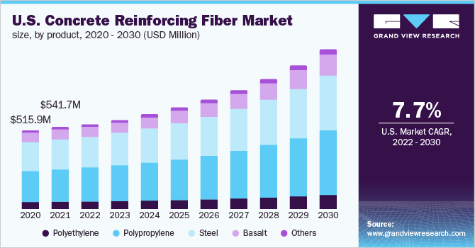 The global concrete reinforcing fiber market size is expected to reach USD 3.96 billion by 2030, registering a CAGR of 6.8% during the forecast period, according to a new report by Grand View Research, Inc. Increasing demand for lightweight non-corrosive materials in the construction industry is expected to boost product demand in the forecast period. The advantages offered by the reinforcing fibers in concrete include widening of joint spacing and reduction in slab thickness. In addition, they also in reducing the spalling at joint edges and the overall formation & maintenance cost. The aforementioned benefits offered by the product are expected to augment its demand in heavy-load operating structures such as runways, aircraft, and warehouses.
