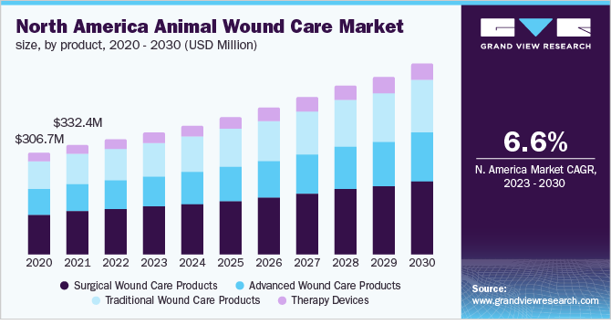 The global animal wound care market size is expected to reach USD 1.82 billion by 2030, according to a new report by Grand View Research, Inc. The market is expected to expand at a lucrative CAGR of 6.92% from 2023 to 2030. Key factors driving the industry growth include the rising adoption of companion animals, increasing pet population, increasing demand for veterinary surgeries, and rising animal injury cases. The global population of companion animals has also increased. In November 2021, the American Veterinary Medical Association (AVMA) reported that the companion animal population increased significantly from 2016 to 2020. As per the article, there were an estimated 76.8 million dogs in 2016 in the U.S., which increased to 83.7 million in 2020.