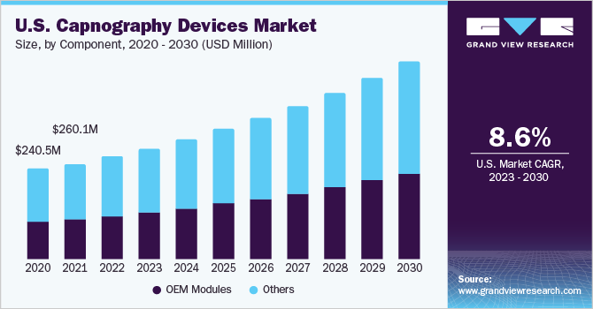 The global capnography devices market was valued at USD 618.1 million in 2022 and is expected to reach a value of USD 1,312.4 million by 2030. The introduction of regulatory guidelines for procedural sedation and the growing adoption of capnography inpatient monitoring due to higher reliability & efficiency are anticipated to propel the market growth over the forecast period. In addition, associated advantages, such as ease of usage, minimally invasive nature, and medical efficiency, are also driving the product demand, thereby supporting market growth. Moreover, rising cases of respiratory diseases needing continuous patient monitoring are expected to fuel the product demand in the coming years.