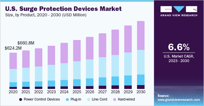 The global surge protection devices market size is expected to reach USD 4.88 billion by 2030, growing at a CAGR of 6.8% from 2023 to 2030, according to a new report by Grand View Research, Inc. The growth of the market can be attributed to the growing need to protect electronic devices from any potential surges. The alternative energy programs being pursued aggressively all over the world and the growing instances of lightning strikes stemming from the increase in global warming are some of the other factors that are expected to drive the demand for surge protection devices (SPD) over the forecast period.
