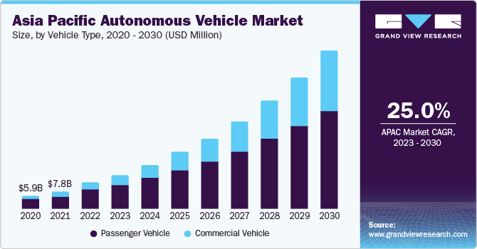 The global autonomous vehicle market size is expected to reach USD 214.32 billion by 2030, according to a new report by Grand View Research, Inc. The market is anticipated to expand at a CAGR of 21.9% from 2023 to 2030. The potential of autonomous vehicles to optimize traffic flow, reduce congestion, and enhance fuel efficiency serves as a significant driver for the growing autonomous market. This capability allures businesses by promising cost-efficient transportation solutions, offering reduced idle time and lower operational expenses. Concurrently, consumers are attracted to the prospect of quicker and more predictable travel experiences. As vehicles demonstrate their potential to impact traffic and travel experiences positively, they gain public acceptance, driving market growth.