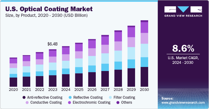 The global optical coating market size is expected to reach USD 37.58 billion by 2030, registering a CAGR of 9.2% from 2024 to 2030, according to a new report by Grand View Research, Inc. The market is estimated to be driven by the growing smart consumer electronics industry across the globe. The rising focus on electricity generation through clean sources is also expected to drive product demand. Consumer electronic devices include smartphones, tablets, phablets, smartwatches, and smart televisions. Rapid urbanization resulting in changes in consumer lifestyles is expected to create lucrative opportunities for smart consumer electronic devices. This is projected to lead to an increase in the utilization of optical coatings as they have a superior optical display and impact resistance properties.