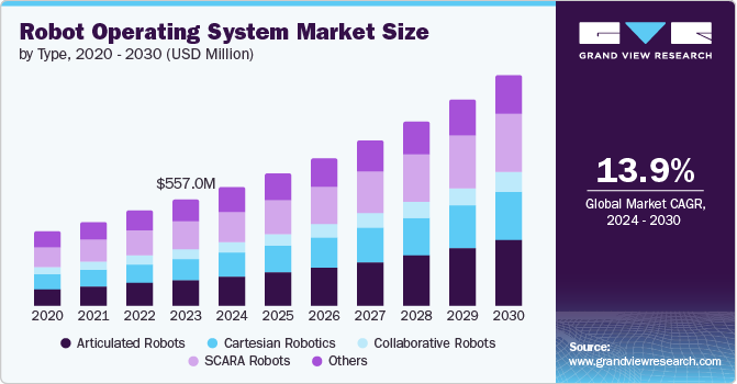 The global robot operating system market size is expected to reach USD 1,214.9 million by 2030, according to a new report by Grand View Research, Inc. The market is anticipated to grow at a CAGR of 13.9% from 2024 to 2030. The robot operating system (ROS) is a comprehensive collection of tools and frameworks designed for developing and controlling robotic systems. ROS is shaping the future of robots in business, enterprise, and development. Traditionally, designing the embedded software in robots was the domain of robotic researchers and designers. Today, Ubuntu serves as the primary base for ROS due to its adaptability and user-friendliness. Being an open-source platform, ROS allows researchers and programmers to write and reuse code for various robotics applications. A global community of engineers and programmers, known as the “robot operating system,” is dedicated to advancing and enhancing ROS’s usability, aiming to make robots accessible worldwide.
