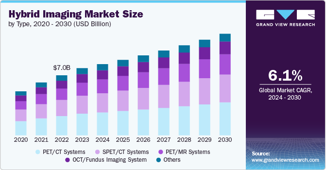 The global hybrid imaging market size is expected to reach USD 11.95 billion by 2030, according to a new report by Grand View Research, Inc., registering a 6.1% CAGR from 2024 to 2030. Increasing demand for accurate diagnostic techniques for cancer and cardiac disorders is expected to drive the market. Rising government initiatives for creating awareness regarding multimodal imaging devices are also expected to contribute toward market growth.