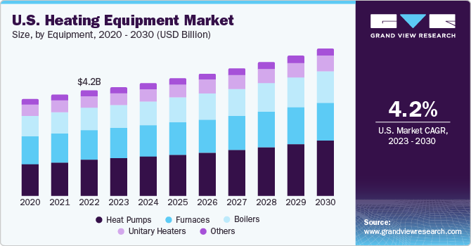 The U.S. heating equipment market size is expected to reach USD 5.88 billion by 2030, registering a CAGR of 4.2% from 2023 to 2030, according to a new report by Grand View Research, Inc. Growing demand for energy-efficient heating equipment and favorable government initiatives is projected to augment market demand over the coming years. The heat pumps segment occupied the largest share in 2015 on account of its increasing preference in the industrial and commercial sectors. Heat pumps are very efficient in converting energy to heat at low operational costs.