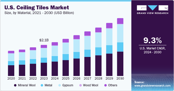 The U.S. ceiling tiles market size is expected to reach USD 3.88 billion by 2030, registering a CAGR of 9.3% from 2024 to 2030, according to a new report by Grand View Research, Inc. The market is expected to grow owing to the growing construction industry around the world. The construction industry is growing due to a rise in public and private investments in infrastructure development activities.