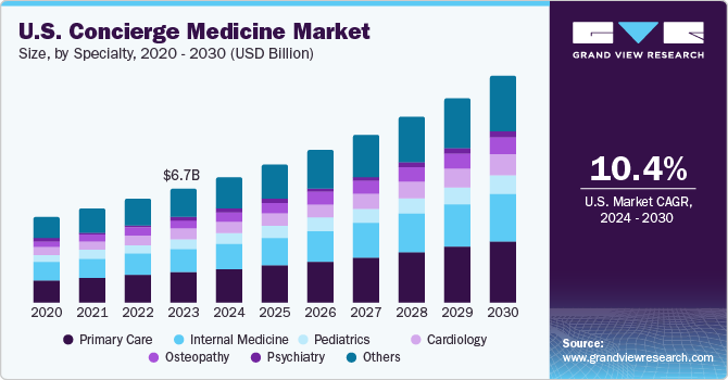 The U.S. concierge medicine market size is anticipated to reach USD 13.3 billion by 2030, based on a new report by Grand View Research, Inc. The market is projected to grow at a CAGR of 10.37% from 2024 to 2030. Rising waiting times for a physician appointment, shortage of physicians, and rising prevalence of chronic diseases are driving patients from conventional settings to non-traditional care settings. This, coupled with more time with physicians, fewer hospitalizations, and a focus on preventive care is driving market growth.