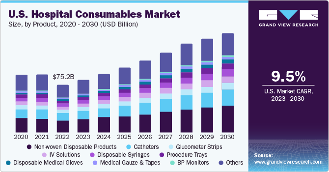 The U.S. hospital consumables market size is expected to reach USD 157.60 billion by 2030, registering a CAGR of 9.55% from 2023 to 2030, according to a new report by Grand View Research, Inc. Rising number of surgeries and prevalence of chronic diseases, coupled with expanding geriatric population in the U.S., is promoting the growth of the market.