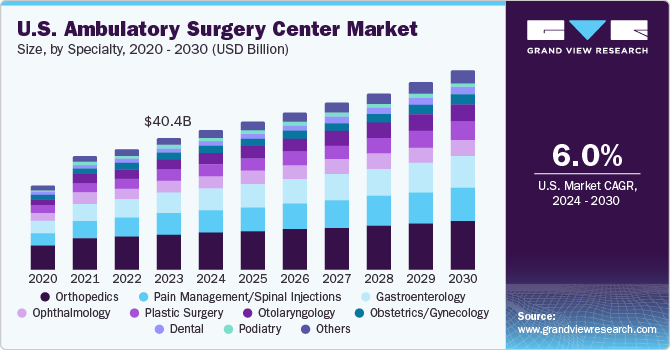 The U.S. ambulatory surgery center market size was estimated at USD 40.41 billion in 2023 and is expected to grow at a CAGR of 6.02% from 2024 to 2030. The U.S. ambulatory surgery center devices market size was estimated at USD 26.57 billion in 2023 and is anticipated to grow at a CAGR of 8.89% from 2024 to 2030.The market growth can be attributed to rising investment in ambulatory surgery centers (ASCs) and favorable reimbursement for services at ASCs in the U.S. For instance, in January 2024, Tarrant Capital IP, LLC, an asset management firm, revealed a strategic investment in Compass Surgical Partners, an independent, full-service ASC management and development partner. The investment aims to accelerate Compass Surgical Partners’ growth, expand its capabilities, and enhance its ability to meet the rising demand for ASC joint ventures among healthcare system partners.