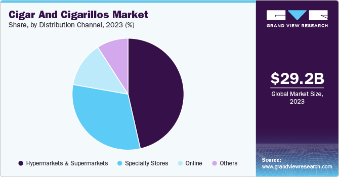 - The hypermarket and supermarket segment dominated the market with 45.9% share in 2023. Availability of wide range of premium and rare cigars in discounted pricing is the key factor supporting the segment growth.