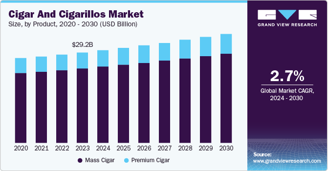 The global cigar & cigarillos market size is expected to reach USD 35.1 billion by 2030, registering to grow at a CAGR of 2.7% from 2024 to 2030 according to a new report by Grand View Research, Inc. Implementation of heavy taxes and increasing price of conventional cigarettes drive the product demand. Increasing number of consumers prefer cigars as they have better reputation and lower price, which is projected to positively influence growth.