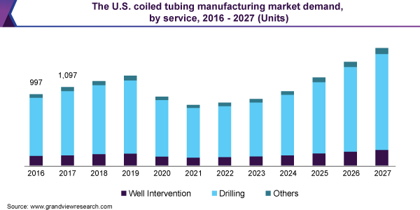 The global coiled tubing manufacturing market size is estimated to reach USD 1.5 billion by 2027 registering a CAGR of 2.9%, according to a new report by Grand View Research, Inc. Increasing popularity of shale reserves in the production of crude oil is projected to augment market growth over the forecast period. The global oil & gas industry remains volatile with high fluctuations in crude oil prices. Reduced crude oil prices coupled with depressed upstream investments in the current scenario are projected to impact the profitability of the market vendors.