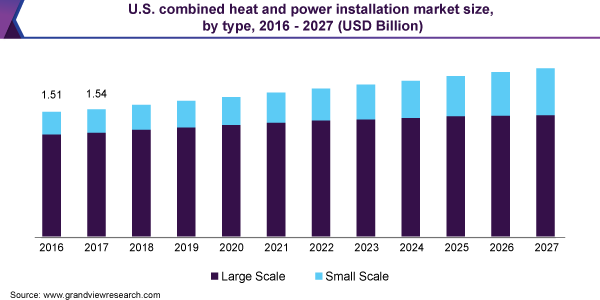 The global combined heat and power installation market size is expected to reach USD 12.0 billion by 2027, according to a new report by Grand View Research, Inc., expanding at a CAGR of 3.1% over the forecast period. Modification in preferences towards replacing conventional sources of energy systems on account of uninterrupted power supply and operational cost is expected to drive the market. Growing energy demand from industrial applications, such as paper, pulp, chemical, cement, pharmaceuticals, refining, and sugar is also expected to have a positive impact on market growth. Rising demand for lighting and space heating applications in retail malls, offices, hospitals, and universities has also encouraged CHP installation for commercial applications.