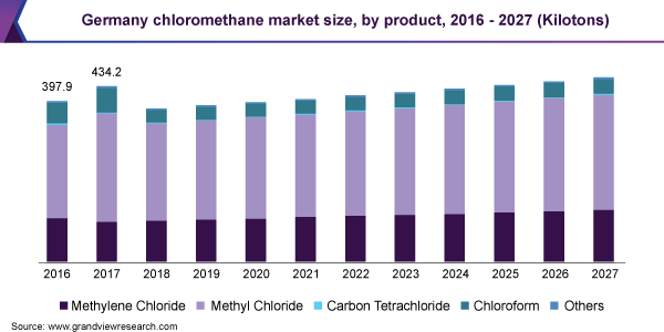 The global chloromethane market size is projected to reach USD 6.7 billion by 2027 registering a CAGR of 4.9%, according to a new report by Grand View Research, Inc. Increasing demand for methylene chloride across major application industries, such as pharmaceutical and chemical intermediates, is expected to drive market growth.
