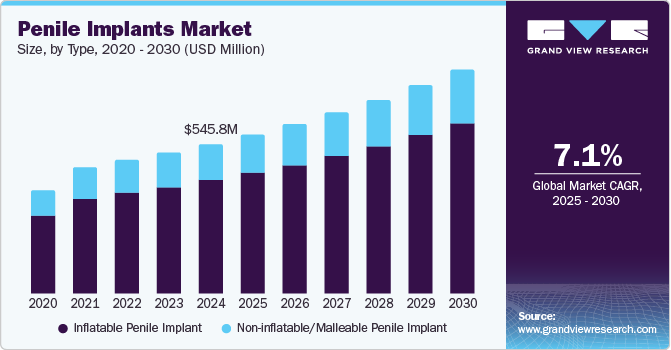 The global penile implants market size is estimated to reach USD 817.0 million by 2030, registering to grow at a CAGR of 7.1% from 2025 to 2030 according to a new report by Grand View Research, Inc. Increasing incidence of Erectile Dysfunction (ED) disorder on a global level as a symptom of associated comorbidities such as diabetes, renal disease, liver disorder, vascular conditions, and atherosclerosis, is a key factor driving the market.