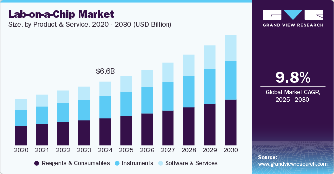 The global lab-on-a-chip market size is expected to reach USD 11.45 billion by 2030 and is expected to grow at a CAGR of 9.76% from 2025 to 2030 according to a new report by Grand View Research, Inc. The market is driven by rising investments in healthcare R&D, integration of AI in diagnostics, and government initiatives supporting personalized medicine and decentralized testing.