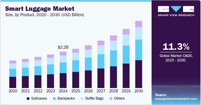 The global smart luggage market size is expected to reach USD 4.14 billion by 2030, growing at a CAGR of 11.3% from 2025 to 2030, according to a new report by Grand View Research, Inc. The integration of advanced technologies such as GPS tracking, Bluetooth connectivity, RFID, and digital locks has transformed traditional luggage into smart travel companions. These features enhance convenience and security, allowing travelers to track their bags in real time, charge devices on the go, and secure their belongings with remote locking systems. The incorporation of IoT (Internet of Things) capabilities further facilitates seamless connectivity with personal devices and travel infrastructure, significantly improving the overall travel experience.
